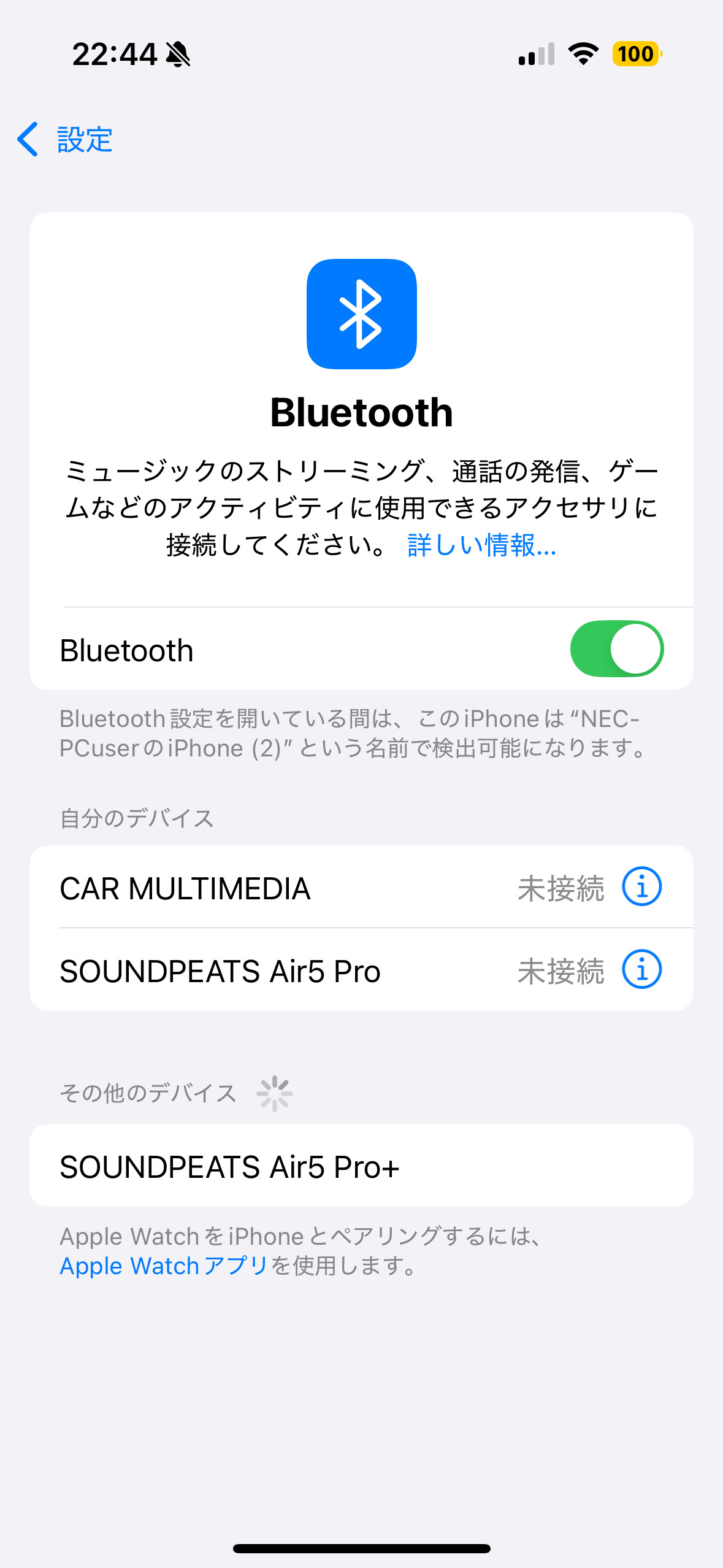 スマートフォンなどのBlueToothをONにすれば、選択肢に「SOUNDPEATS Air5 Pro」が表示されます。